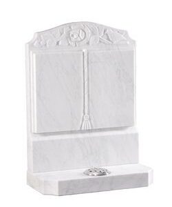 Marble HS 30″ x 24″ x 3″ Base 3″ x 30″ x 12″ A fully worked book with caved rose and dove above.